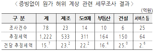 - 국세청, 증빙없이 원가 허위계상한 기업서 1222억원 추징