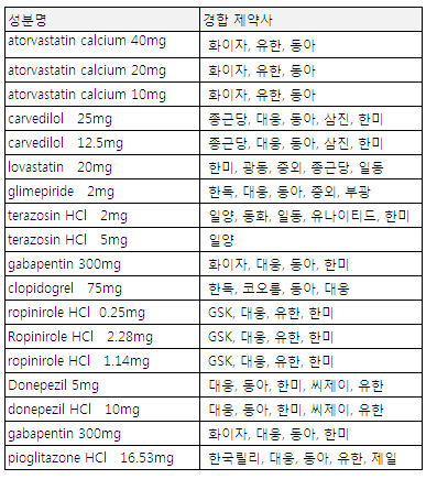 카르베딜롤제제는 종근당과 대웅, 동아, 삼진, 한미 등 5개회사가 복수로 선정됐고 글리메피리드제제는 한독과 대웅, 동아, 중외, 부광 등이 경합한다.