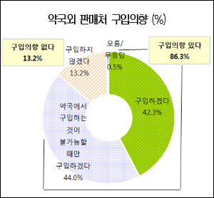약국 외 장소에서 일반약을 구매할 의향을 묻는 질문에는 '구입할 것'이라는 답이 42.3%, '약국에서 구입 불가능하면 구입할 것'이 44.0%로 나타났고, 편의점 등에서 '구입하지 않겠다'는 답은 13.2%에 불과했다.
