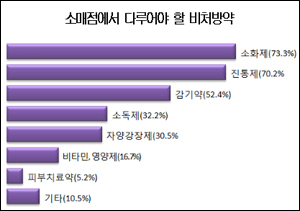 일반 소매점에서 다뤄야 할 일반약으로는 소화제(73.3%), 진통제(70.2%), 감기약(52.4%), 소독제(32.2%), 자양강장제(30.5%), 비타민·영양제(16.7%) 등의 순으로써 상의는 "비처방약에 대해서는 약사의 도움을 필요로 하지 않았다"고 평가했다.