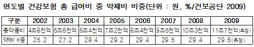 또한 자료에 따르면 지난해 우리나라 약제비 보험급여비가 11조7천억원에 이르고 이는 OECD국가의 평균 약제비 비중인 17.6%의 1.7배에 해당하는 수치다. 건강보험 지출에서 2003년~2008년 증가율은 13.6%로 OECD국가 평균의 2배가 넘는다.