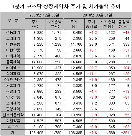 동아제약과 일양약품 및 LG생명과학은 시가총액이 3개월만에 각각 1359억원, 903억원, 812억원이 감소했다.