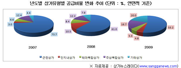 2009년에는 전체 상가 중 근린상가 59.2%, 단지내 상가 14.4%, 테마 멀티상가 3.6%, 주상복합상가 18.4%, 기타상가 4.4%를 기록했다.
