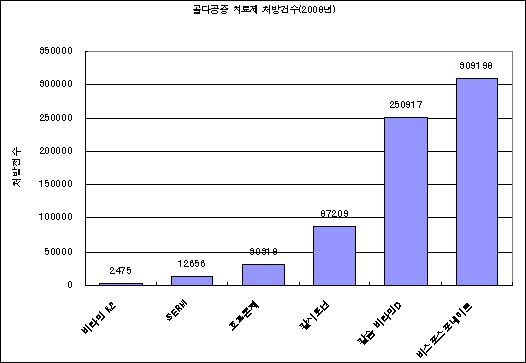 또 2008년 전체 외래처방전의 10% 수준인 60만3870건을 추출해 치료제 사용양상을 분석한 결과 전체처방의 약 50%가 비스포스포네이트 제제로 구성됐으며, 비스포스포네이트 제제 중 경구 형태로 주 1회 복용하는 제형이 82%를 차지했다.