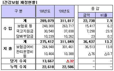 건강보험공단(이사장 정형근)은 2009년 건강보험 재정 수지는 31조2000억원을 기록한 가운데 누적재정은 2조2586억원 흑자, 당기재정은 32억원 적자를 기록한 것으로 나타났다.