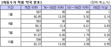 나머지 95곳(13.09%)은 일당 조제건수 76건 이상 100건 이하, 43곳(5.92%)은 101건 이상 150건 미만, 4곳(0.55%)은 150건 이상을 소화했다.