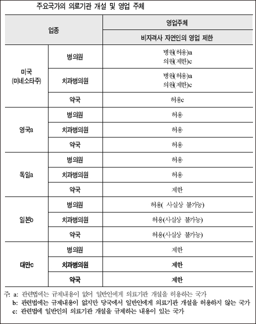 대만 역시 약국, 병의원 등 요양기관을 면허가 없는 사람이 개설·운영하는 것을 허용하지 않고 있는 것으로 보사연은 파악했다.