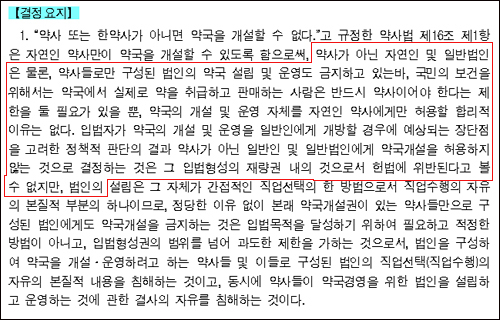 당시 헌재는 헌재는 약사 또는 한약사가 아니면 약국을 개설할 수 있다고 규정한 구 약사법 16조1항에 대해 헌법 불합치 결정요지를 통해 "약국의 개설 및 운영 자체를 자연인인 약사에게만 허용할 합리적 이유는 없다"고 언급했다.