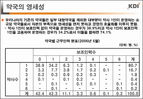 KDI가 제시한 자료에 따르면 지난 2006년을 기준으로 약사 1인이 보조인력 없이 약국을 운영하는 경우가 전체의 38.9%, 보조인력 1명을 고용한 경우가 34.2%로 전체의 74.1%의 약국이 약사 1명으로 운영되고 있다.