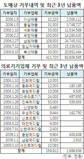 의료기기업체의 기부금은 진욱메디칼이 5000만원으로 제약·도매에 비해 규모가 크지 않은 것으로 나타났다.