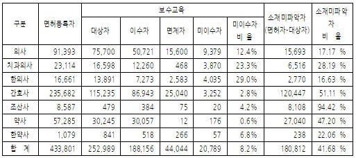 - 미이수율 의사 12.4%, 한의사 29%, 약사 0.6%