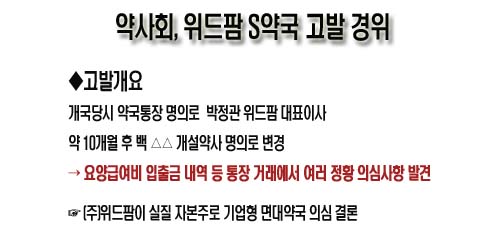 또한 약사회는 위드팜 S약국의 경우 ▲요양급여비 입출금 내역 등 통장 거래내역에서 여러 정황이 의심되고 ▲(주)위드팜이 실질 자본주로 기업형 면대약국으로 의심돼 결국 약사회 면대 TF팀이 진정형식으로 지난 4월 27일 검찰에 고발한 것이라고 주장했다.