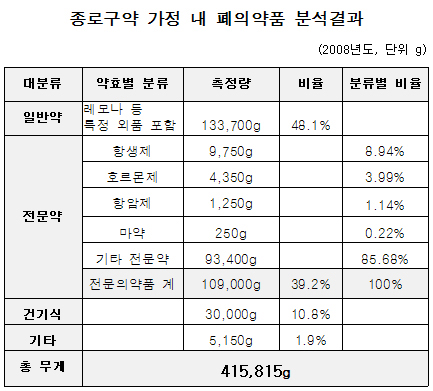 이에 앞서 종로구약이 2007년 시범사업에서 제형 및 약효군별로 합산 분석한 결과 총 수거량 10만6034g 가운데 일반약과 전문약은 각각 43.1%, 44.2%로 나타났다.