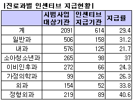 이외 대구, 광주, 수원, 창원시도 평균 20~30% 가량 절감 효과가 나타나 전체적으로 약 35억원이 줄었다고 심평원은 밝혔다. 진료과별로는 정형외과의 인센티브 지급률이 40%(참여기관 219곳 중 지급대상 89곳)를 기록해 가장 높았다.