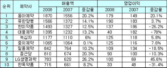 동아제약도 매출액과 영업이익 모두 20%대의 성장률을 기록하며 리딩기업으로서의 자존심을 지켰다.