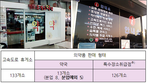반면 약사 없이 의약품을 취급할 수 있도록 허용된 특수장소취급점은 무려 126곳이 휴게소에 성업하고 있어 사실상 휴게소에서는 약국외 장소에서 일반약이 팔리고 있는 것이다.