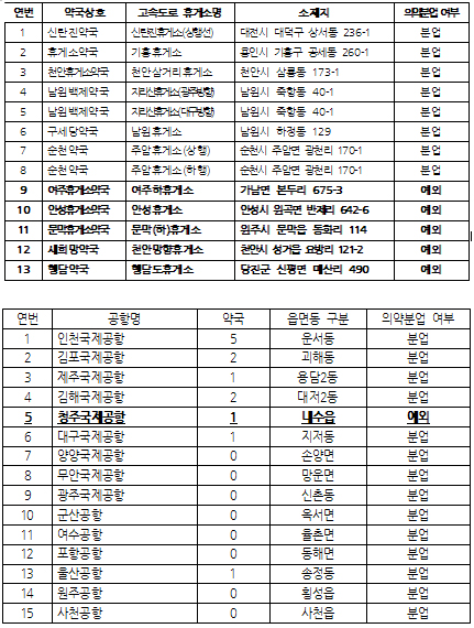 인천국제공항에 5곳의 약국이 입점, 가장 많았고 김포국제공항 2곳, 제주국제공항 1곳, 김해국제공항 1곳, 대구국제공항 1곳, 청주국제공항 1곳, 울산공항 1곳 등 총 13곳이다. 이중 청주국제공항 약국만 분업예외다.