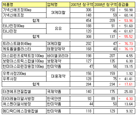 반면 아스피린류 청구액은 상승세를 그리고 있는 것으로 나타났다.