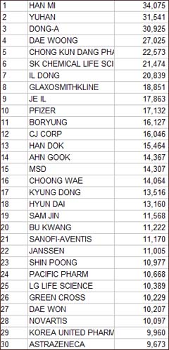 한미약품이 5개월 만에 다시 1위로 올라 선 것을 비롯, 유한양행, 동아제약, 대웅제약, 종근당 등이 현재 MR들의 방문이 가장 활발한 회사인 것으로 나타났다. 이들 상위 10개 제약회사가 전체 대비 31.1%를 차지하고 있었다.