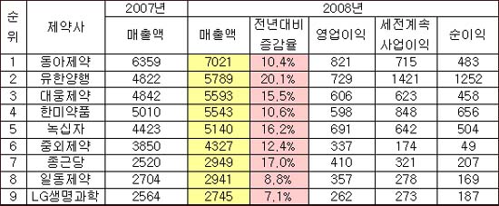 동아 7000억 돌파…유한·종근당 성장률 최고
