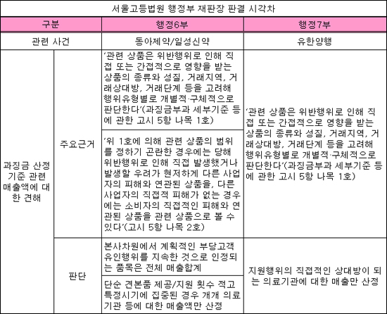 또 행정6부는 제약사가 '관련 매출' 범위를 산정하면서 본사차원에서 판촉계획을 수립해 지속적으로 지원행위를 했는지 여부에 주목했지만, 행정7부는 별도로 언급하지 않았다.