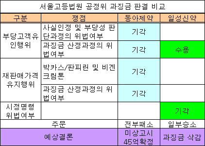 재판부는 다만 “당사자가 제출한 증거나 법원의 증거조사에 의해 나타난 증거자료만으로는 정당한 과징금 액수를 산출할 수 없어 과징금 전부(14억여원)를 취소할 수밖에 없다”고 결론지었다.
