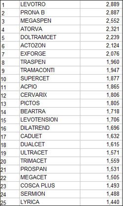 이어 레보트로(3241건), 스티렌(2953건), 프로나B(2922건), 엑스포지(2879건), 리피토(2637건), 서바릭스(2560건), 메가스펜(2552건), 아토르바(2500건), 가나톤(2476건)순으로 나타났다.