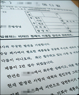 A메디칼측은 H사에 발송한 공문을 통해 "최근 접수되고 있는 사항 중 비타민 정재에 이물질이 발견된 제품이 2건 접수됐다"며 "현재 발생된 사항의 대책과 원인규명, 시정될 사항 등을 서면으로 답변해 달라"고 밝혔다.