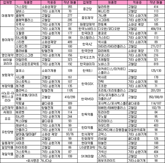 동아는 ‘스티렌’, ‘오팔몬’, ‘플라비톨’ ▲유한은 ‘알마겔’, ‘안플라그’ ▲대웅은 ‘올메텍’ 시리즈와 ‘가스모틴’, ‘우루사’ ▲한미는 ‘아모디핀’ ▲종근당은 ‘딜라트렌’, ‘애니디핀’ 등 대형품목이 대거 포함됐다.