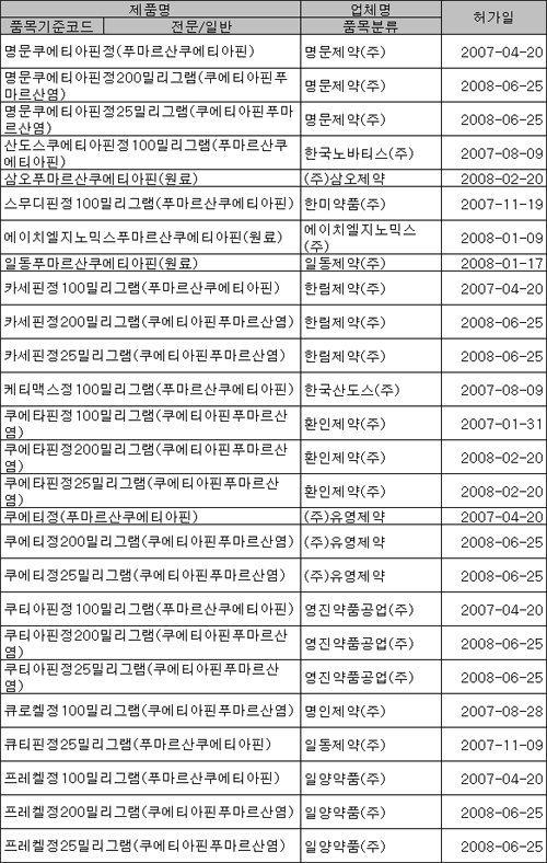 ‘쎄로켈’ 속방형 제네릭은 환인제약과 명문제약을 포함해 10개 제약사가 25개 품목(원료는 제외)에 대해 시판허가를 받았거나 준비 중이어서 앞으로 각축전이 예상되고 있다.
