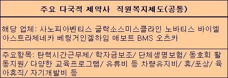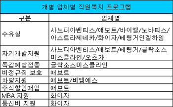 또 직원들의 취미·여가활동을 지원하기 위한 복지카드 혹은 복지마일리지나 탄력시간근무제를 통해 업무의 효율성을 높이려는 노력 또한 다국적 제약기업이 공통적으로 시행하고 있는 복리후생 프로그램이다.