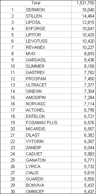 또한 엑스포지, 리피토, 레보투스, 레바넥스, 엠빅스, 가다실, 슬리머 등이 상위권에 포진하고 있는 것으로 밝혀졌다.