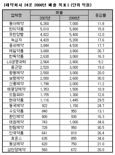 제약사 매출 목표를 집계한 결과 24개 제약업체 평균 성장률이 21.15%로 조사된 것.