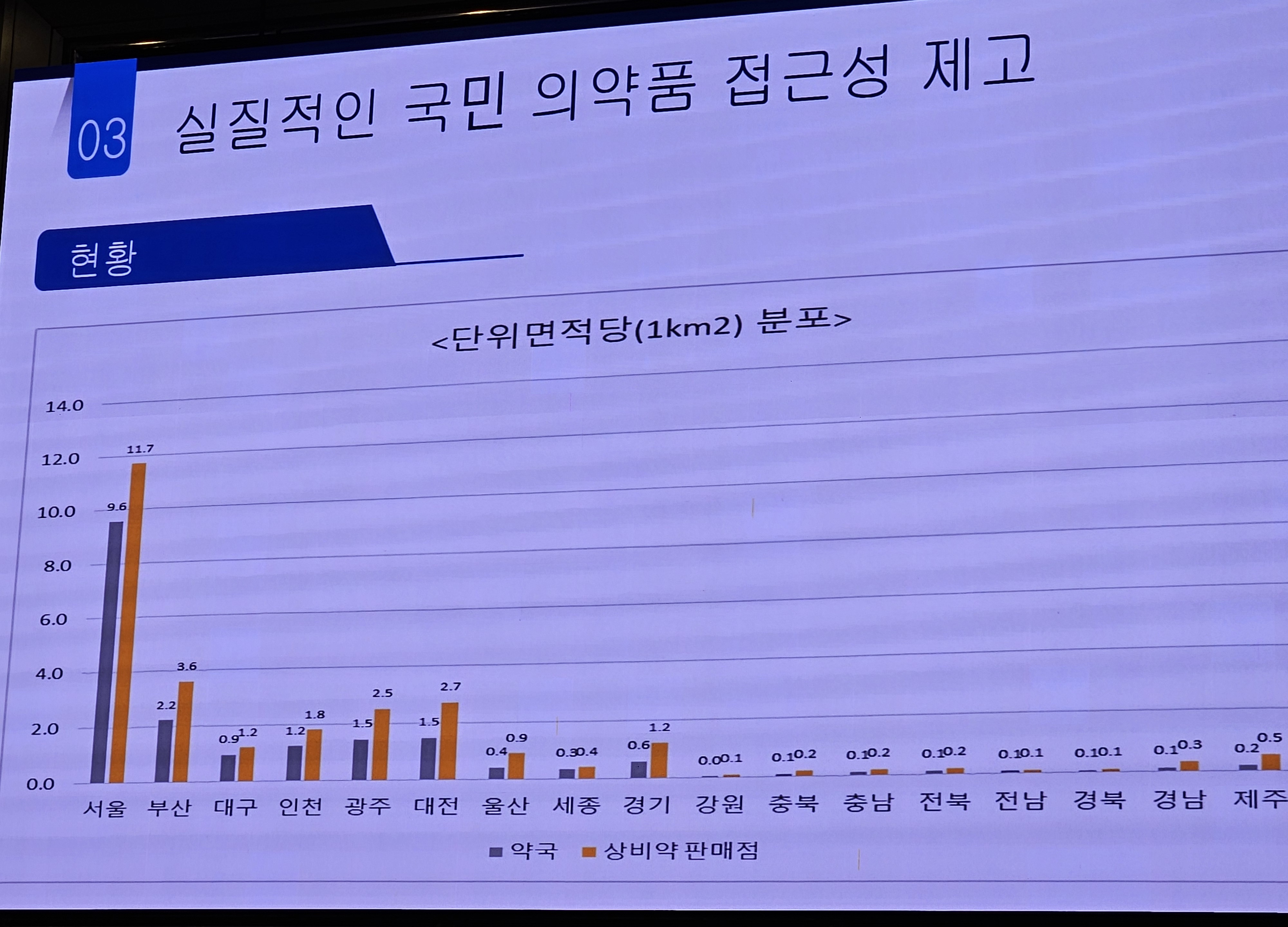 이어 “안전상비약 판매점의 경우도 지역 별로 최대가 11.7개, 최소가 0.1개로 평균은 1.6개에 그친다. 평균 미만이 12개 시·도인 것으로 나타났다”면서 “보완적 제도들이 지역 간 의약품 접근성 격차를 해소하기에는 한계를 보이고 있는 것으로 볼 수 있다”고 했다.