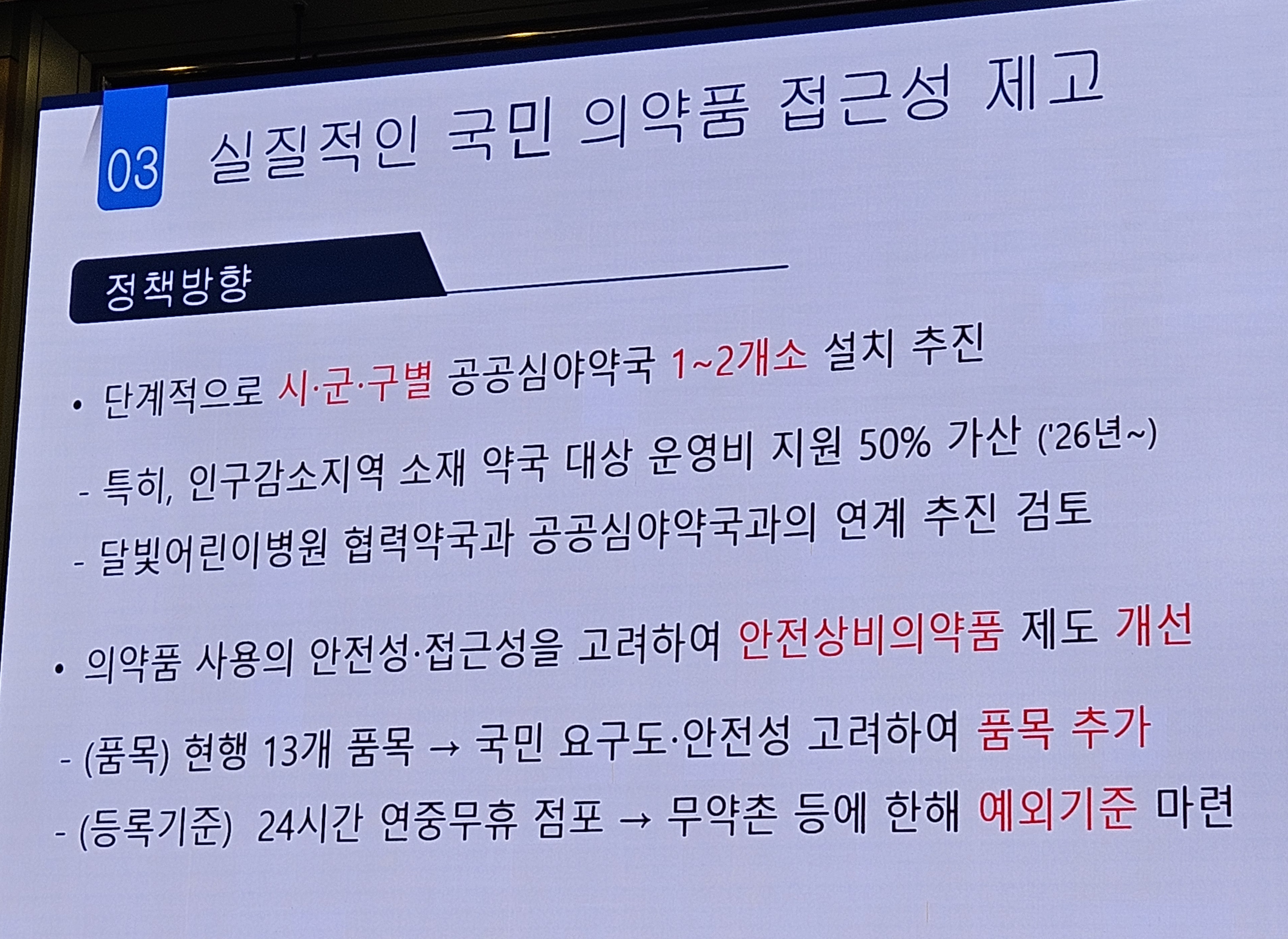 이 같은 한계를 개선하기 위한 방안으로 공공심야약국 확대와 더불어 안전상비약 품목 추가, 판매점 등록 기준 완화 등의 정책 방향이 제시됐다.