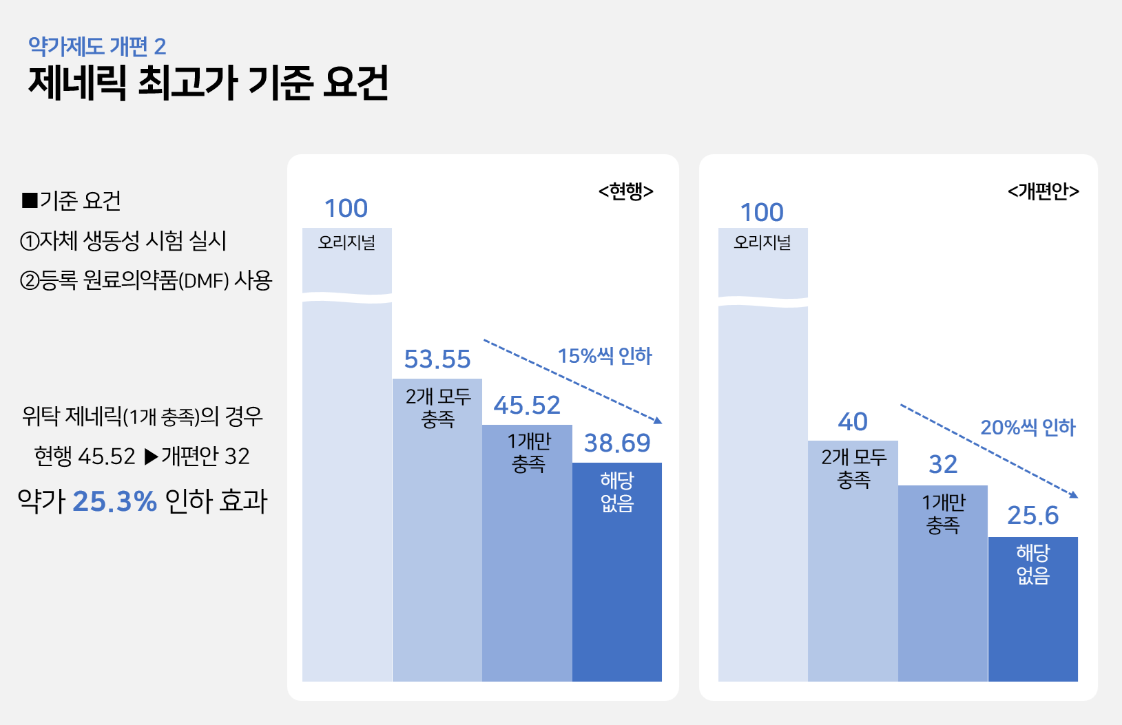 정부가 개편 약가제도에서 2020년부터 적용한 최고가 충족 요건을 유지하면서 미충족 요건에 따른 인하율이 더욱 확대된다. 최고가 요건을 충족하지 못하는 제네릭의 약가는 더욱 떨어진다는 의미다.