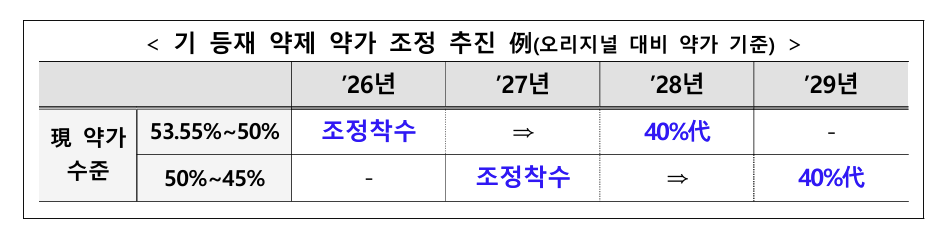 복지부는 개편 약가제도를 보고하면서 기등재 의약품의 약가 조정 일정 방안을 제시했는데 현재 제네릭 약가가 45~50% 수준에서 설정된 제품은 2027년 약가 조정에 착수하고 2029년 40%대로 인하하겠다고 공표했다. 현재 제네릭 약가가 45%인 제품도 약가 조정 대상으로 분류된 것은 제네릭 약가기준이 45%를 초과할 수 없다는 얘기가 된다. 정부가 새로운 제네릭 산정기준을 40%대로 못 박으면서 개편 약가제도에서 나올수 있는 가장 낮은 약가는 40%다.