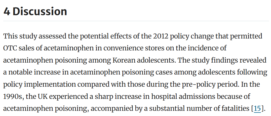 계 박사는 "연구결과 정책 시행 후 청소년들 사이에서 정책 이전 시기에 비해 아세트아미노펜 중독 사례가 현저히 증가한 것으로 나타났다"며 "중독 증가가 2012년 규제 완화만으로는 완전히 설명할 수 없다. 다만 아세트아미노펜 중독 발생률을 완화하기 위한 다면적 접근의 시급함을 강조한다. 아세트아미노펜 판매 규정 재검토와 고위험 청소년을 대상으로 한 교육 프로그램 시행 등 주요 전략이 필요하다"고 설명했다.