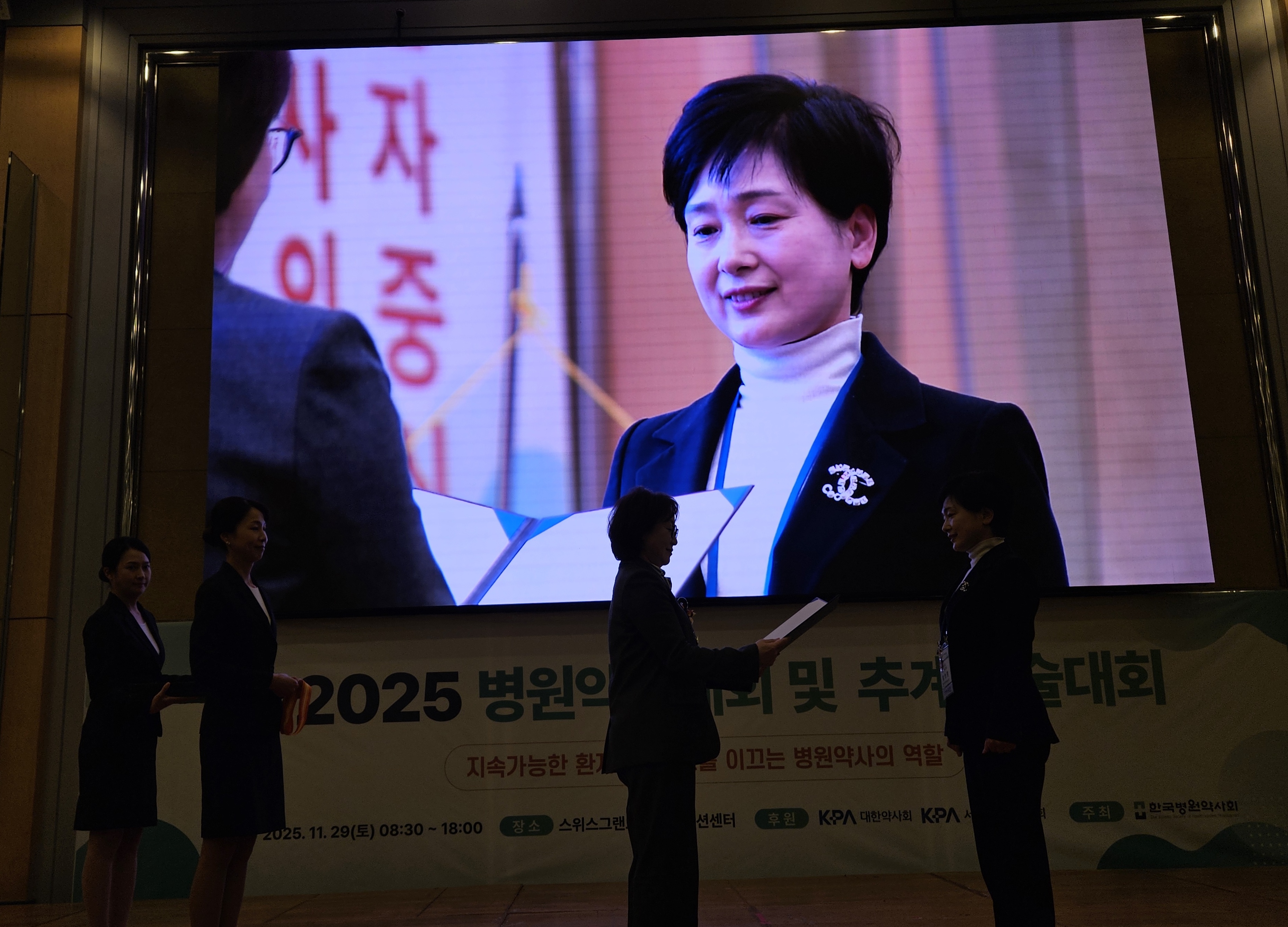 황보영 한국병원약사회 수석부회장(동탄성심병원 약제팀장)은 지난 29일 열린 병원약사대회에서 병원약사대상 수상을 위해 오른 단상에서 눈시울을 붉혔다.