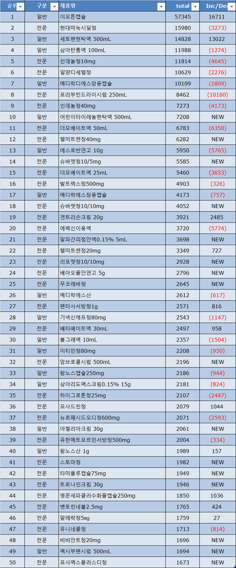 2위는 1만5980회를 차지한 현대미녹시딜정이, 3위는 1만4828회를 기록한 세토펜현탁액이 이름을 올렸다. 환절기 감기와 독감 유행으로 감기 관련 제제 수요가 늘어난 것인데, 삼아탄툼액과 어린이타이레놀현탁액도 4위와 10위에 올랐다.