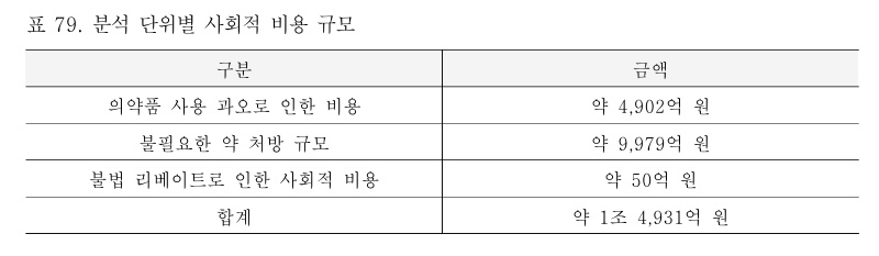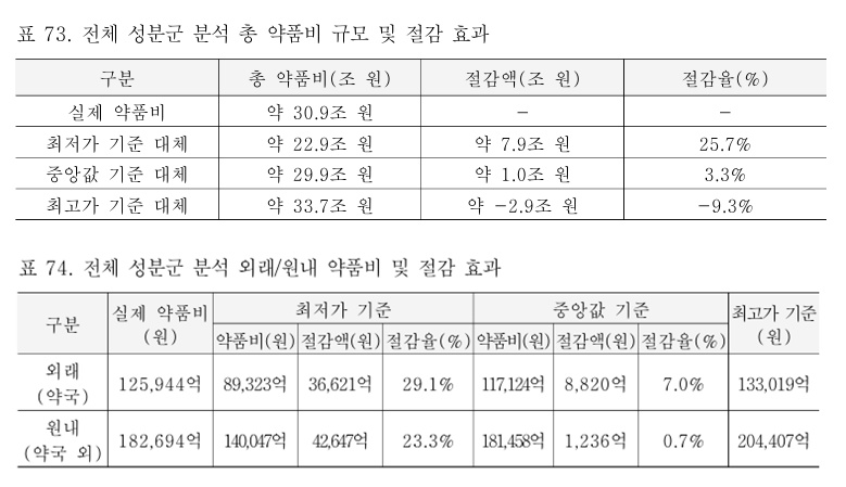 3단계인 전체 성분군을 대상으로 한 분석 결과를 보면 실제 총 약품비는 약 30.9조원이며, 최저가로 대체할 시의 총 약품비는 약 22.9조원이다. 이에 따른 절감 규모는 약 7.9조 원이며, 이는 실제 약품비 대비 약 25.7%라는 것이 연구소 측 설명이다.