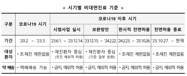 비대면 진료가 대면진료의 보완적 수단이라는 점을 명시하고, 해당 의료 기관에서 일정 기간 내에 동일한 증상으로 대면해 진료받은 기록이 있는 환자에 대하여 실시한다.
