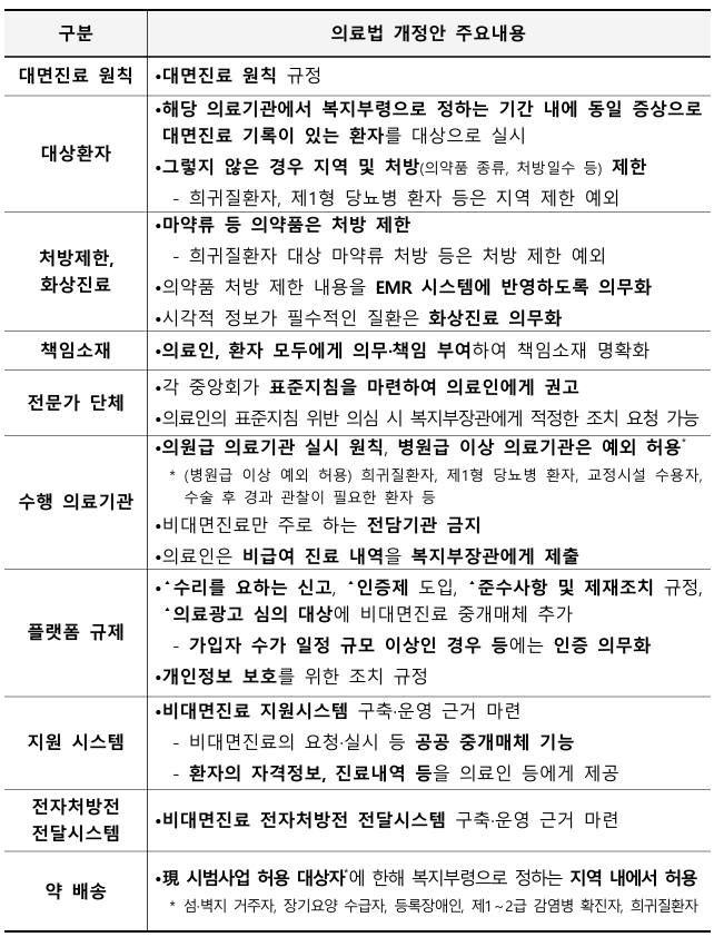 ◆4대 원칙 반영 = ▲대면진료 원칙 ▲의원급 의료기관 중심 ▲재진 환자 중심 ▲전담기관 금지 등 안전성 측면에서 의료계와 합의한 4대 원칙을 고려하면서, 기술 발전을 고려한 유연한 법 체계를 마련했다는 평가다.