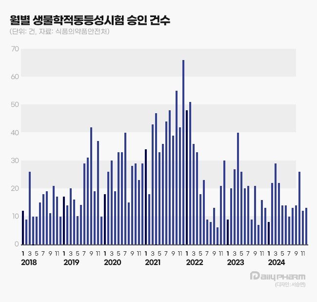 식약처에 따르면 지난 2018년 생동성시험 승인 건수는 178건을 기록했는데 2020년 323건으로 2년 만에 81.4% 증가했고 2021년에는 505건으로 3년 전보다 3배 가량 확대됐다.