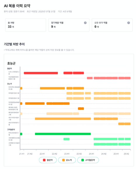 AI를 통해 환자의 과거 처방을 자동으로 불러와 질환군별로 구조화해 정리해 정리해 줌으로써 중복약물·성분을 자동 탐지하고, 용량·횟수 변경 같은 핵심 변경 이력을 한눈에 확인할 수 있다.