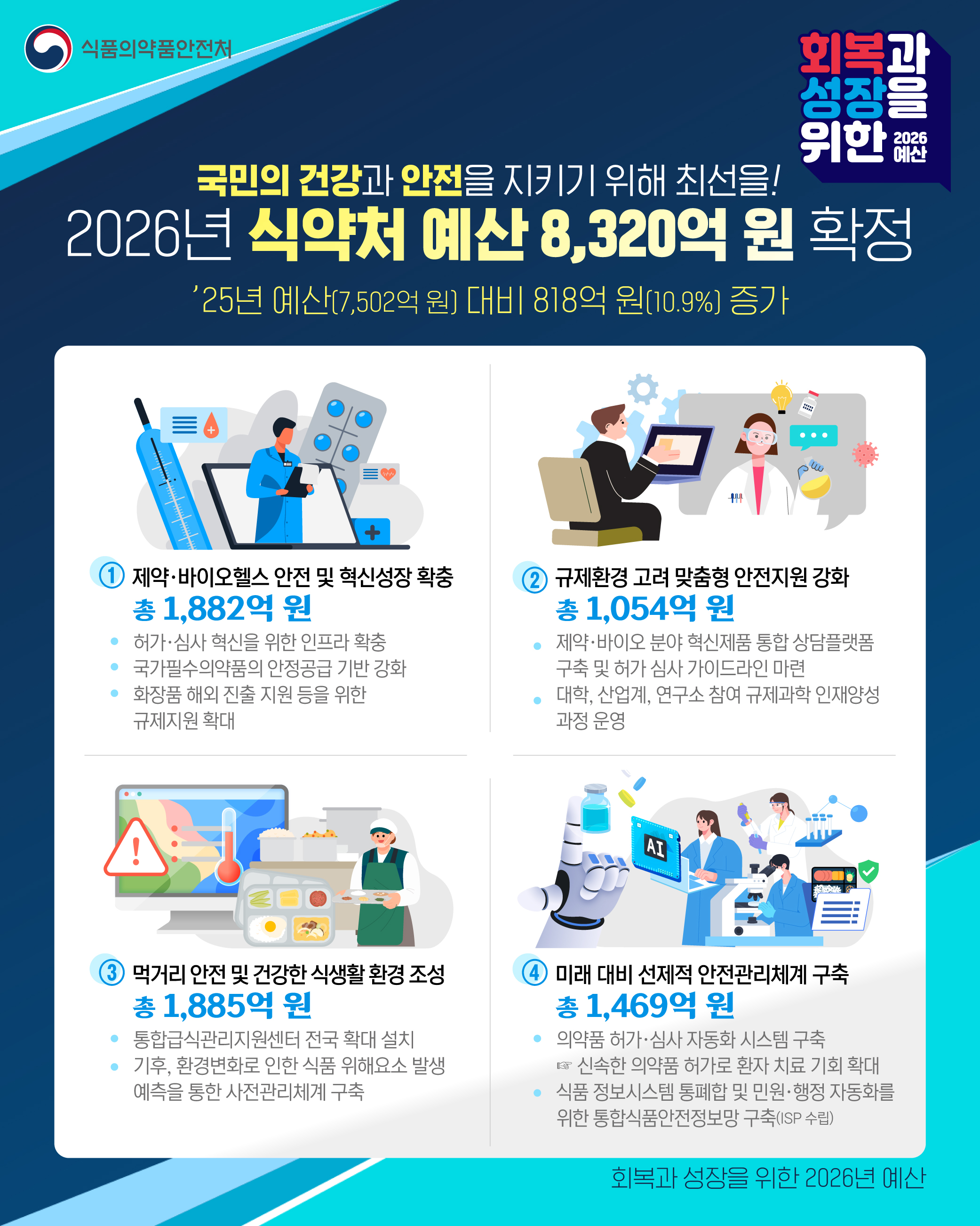 식약처는 2026년도 예산을 올해(7502억원) 대비 818억원 증가(10.9%)한 총 8320억원으로 최종 확정했다고 4일 밝혔다.