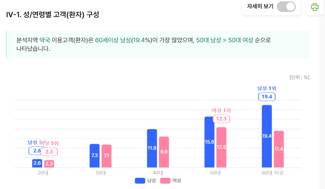 약국의 경우 60대 이상 남성이 19.4%로 가장 많았고 50대 남성 15.8%, 50대 여성 12.5%, 40대 남성 11.9%, 60대 이상 여성 11.4% 등 순이었다.