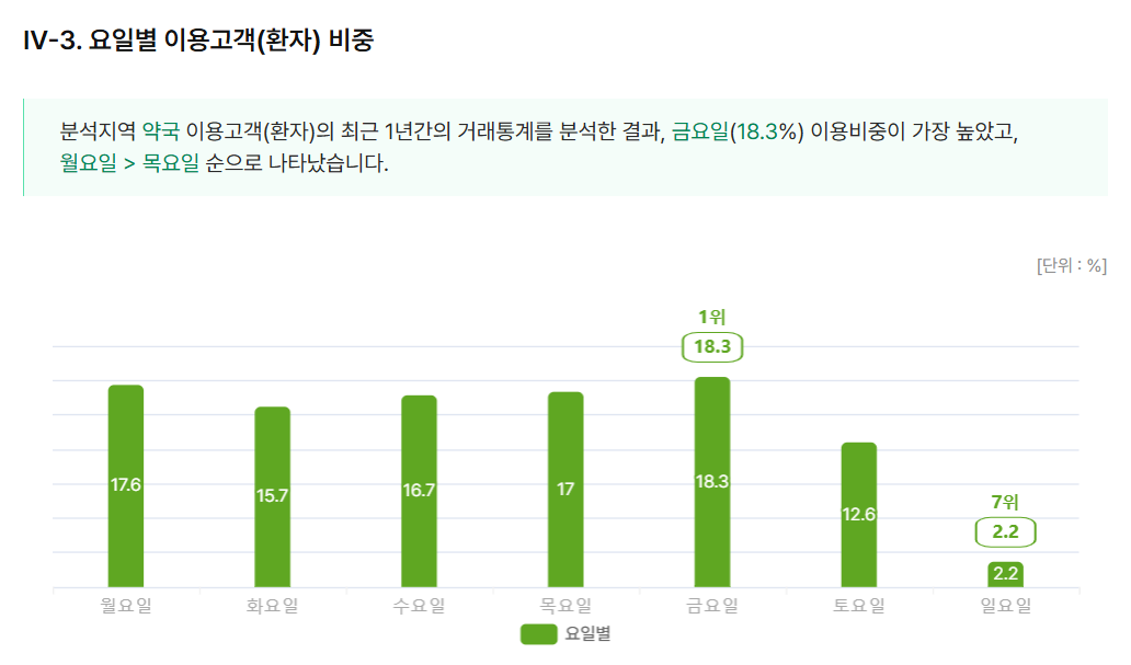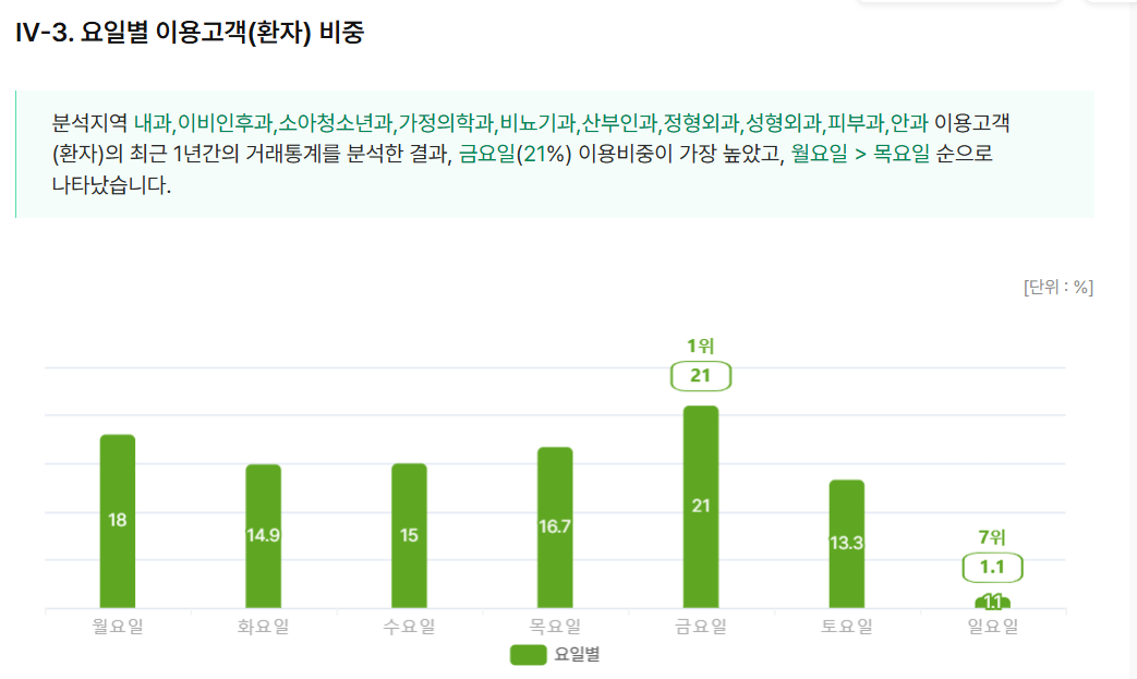 요일별로는 의원과 마찬가지로 금요일이 18.3%로 가장 많았고 월요일 17.6%, 목요일 17%, 수요일 16.7%, 화요일 15.7%, 토요일 12.6%, 일요일 2.2%로 나타났다.