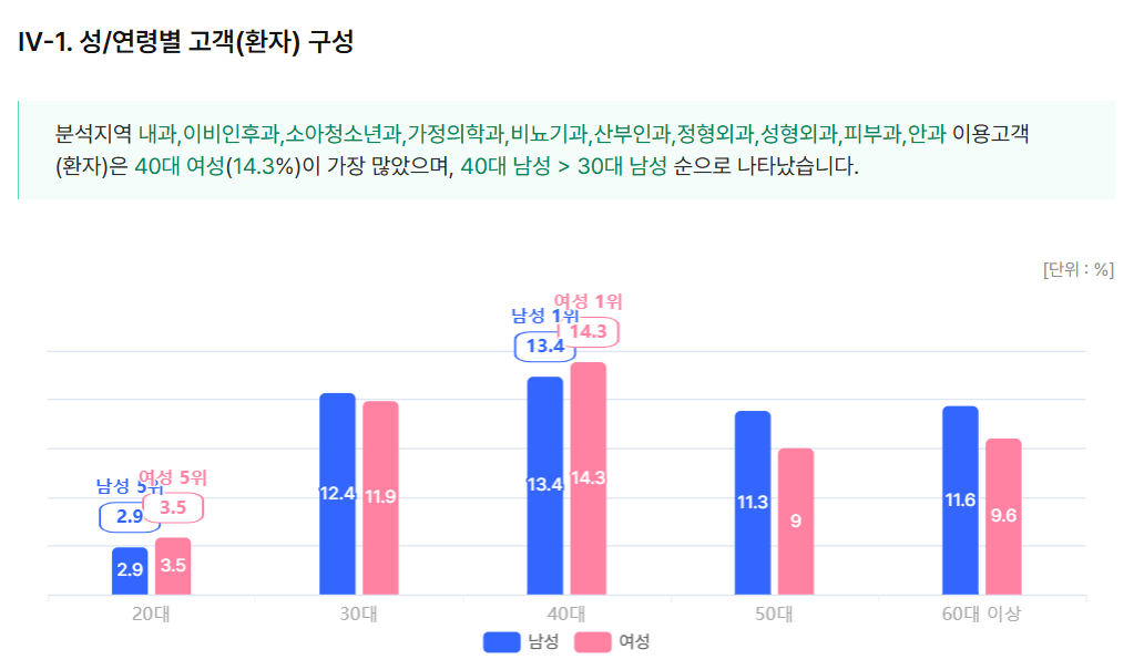 의원 고객(환자)를 성별·연령별로 구분한 결과 40대와 30대가 두드러졌다. 40대 여성이 14.3%로 가장 많았고 40대 남성 13.4%, 30대 남성 12.4%, 30대 여성 11.9%, 60대 이상 남성 11.6%, 50대 남성 11.3%, 60대 이상 여성 9.6%, 50대 여성 9%, 20대 여성 3.5%, 20대 남성 2.9%의 분포를 보였다.