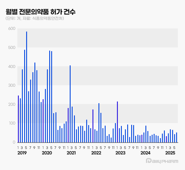 2018년 허가받은 전문약은 월 평균 130개를 기록했는데 2019년에는 4195개로 월 평균 350개로 2배 이상 폭증했다. 2019년 5월에는 한 달 동안 허가 받은 전문약이 584개에 달했다. 2018년 10월부터 2020년 7월까지 매월 100개 이상의 전문약이 쏟아졌고 2020년 8월 23개월 만에 전문약 허가가 100개 미만으로 떨어졌다. 지난 2023년 1월 216개의 전문약이 허가받은 이후 올해 6월까지 매월 허가받은 전문약은 100개에 못 미쳤다.